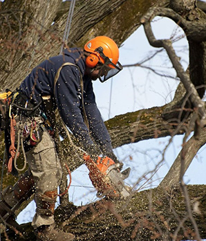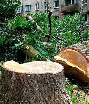 Арборист убирает сильно разросшуюся крону, растущие ветки и производит удаление пней и порубочных остатков.