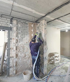 Изначально очищаем поверхность стен для оштукатуривания от остатков образовавшегося строймусора, если необходимо производится демонтаж и размывка.